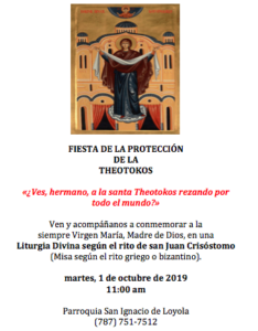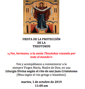 Come and commemorate with us the ever-Virgin Mary, Mother of God, in a Diving Liturgy according to the rite of St. John Chrysostom (Mass according to the Greek/Byzantine rite).